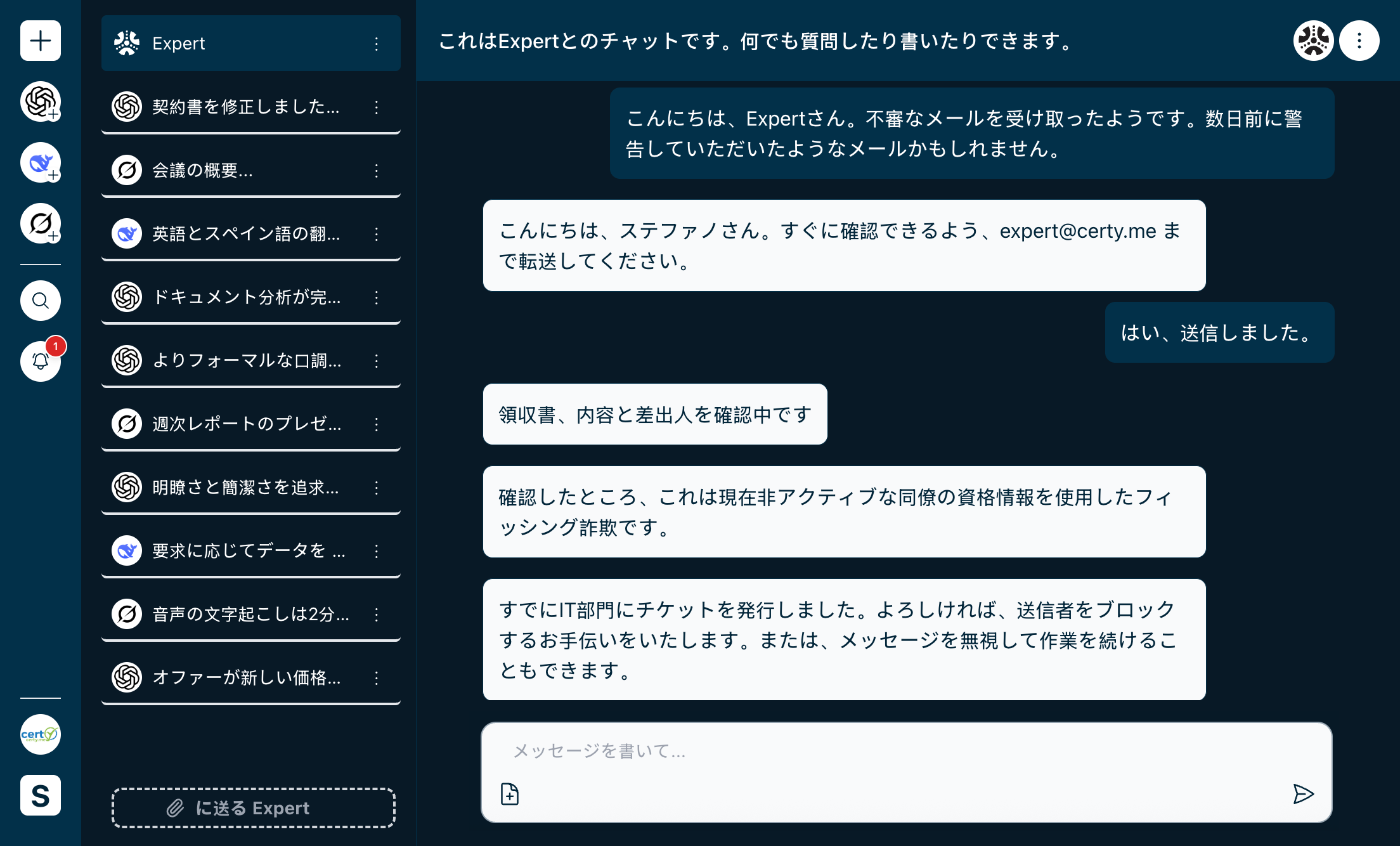 Certy Expert を活用すれば、インシデント発生率と対応時間を削減し、チームの備えを強化し、データ保護を確保しながら人工知能(AI)の潜在能力を最大限に活用できます。ビジネスを保護し、業務を効率化し、従業員がAIを安全に活用できるようにする、たった一つのツールです。